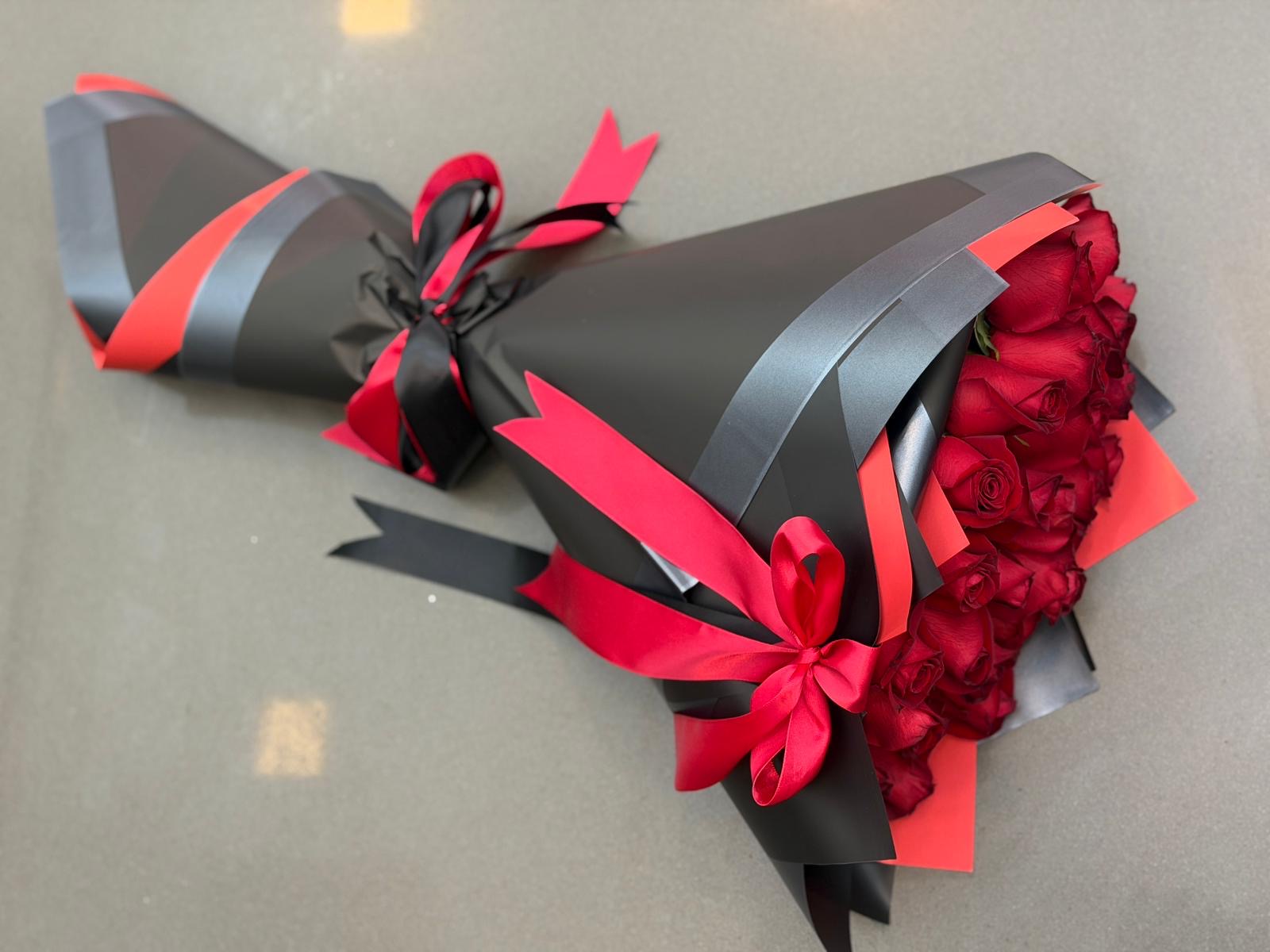 קלאסיקה שלא יוצאת מהאופנה ? ורדים אדומים בעטיפה שחורה – שילוב של עוצמה, יוקרה ונוכחות בלתי נשכחת. העטיפה יכולה להשתנות בהתאם למלאי החנות .